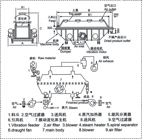 振動源采用振動電機驅(qū)動,運轉(zhuǎn)平穩(wěn),維修方便,噪音低,壽命長。流態(tài)化勻稱,無死空隙和吹穿現(xiàn)象,可以獲得均勻的干燥、冷卻制品??烧{(diào)性好,適應(yīng)面寬。料層厚度和機內(nèi)移動速度以及全振幅變更均可實現(xiàn)無極調(diào)節(jié)。對物料表面的損傷小,可用于易碎物料的干燥,物料顆粒不規(guī)則時亦不影響工作效果。采用全封閉式的結(jié)構(gòu),有效地防止了物料與空氣間空叉感染,作業(yè)環(huán)境清潔。機械效率與熱效率高,節(jié)能效果好,比一般干燥裝置可節(jié)能30%-60%。