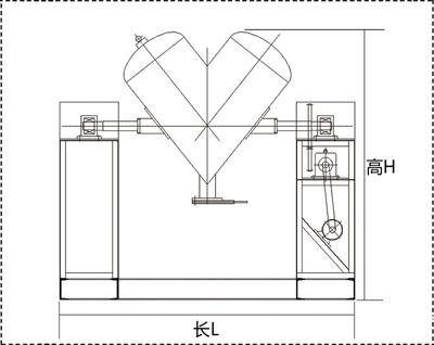 該機(jī)混合筒采用V型不對(duì)稱筒身,在筒身頂部裝有快開(kāi)式旋蓋,便于加料。筒身底部裝有轉(zhuǎn)閥,密封性好,出料方便。加料從頂部加入后旋緊快開(kāi)旋蓋手柄,由時(shí)間繼電器設(shè)定混合時(shí)間,按下起動(dòng)按鈕,混合筒沿軸線旋轉(zhuǎn),物料在V型筒體內(nèi)均勻混合,到設(shè)定時(shí)間后,電機(jī)自動(dòng)停止運(yùn)轉(zhuǎn),點(diǎn)動(dòng)起動(dòng),停止按鈕,使出料閥門轉(zhuǎn)至向下位置,打開(kāi)蝶閥出料。