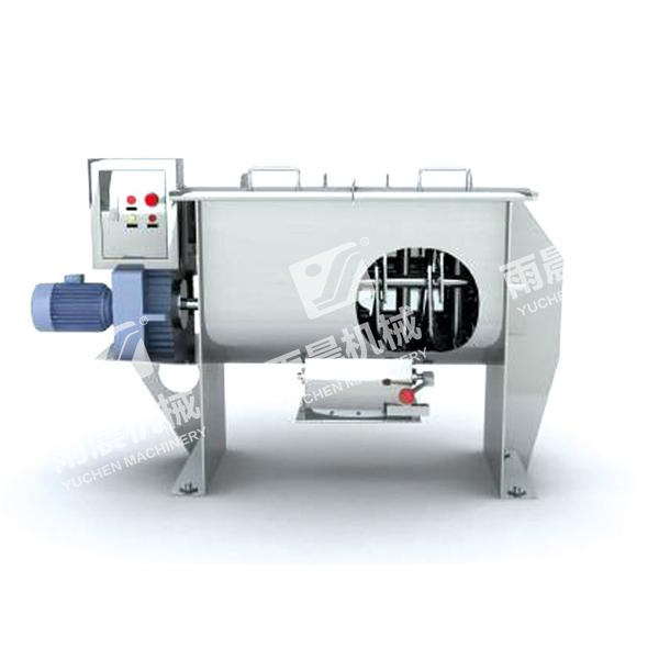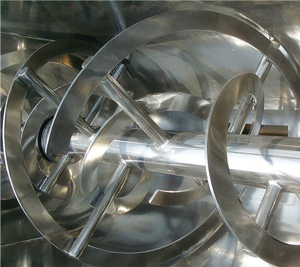 該機(jī)由混合槽、螺旋攪拌葉片和傳動部件等組合合成,螺旋葉片一般做成二層,外層螺旋將物料從兩側(cè)向中央?yún)R集,內(nèi)層螺旋將物料從中央向兩側(cè)分流,使物料在混合槽內(nèi)形成對流混合,從而達(dá)到高均勻度混合。
